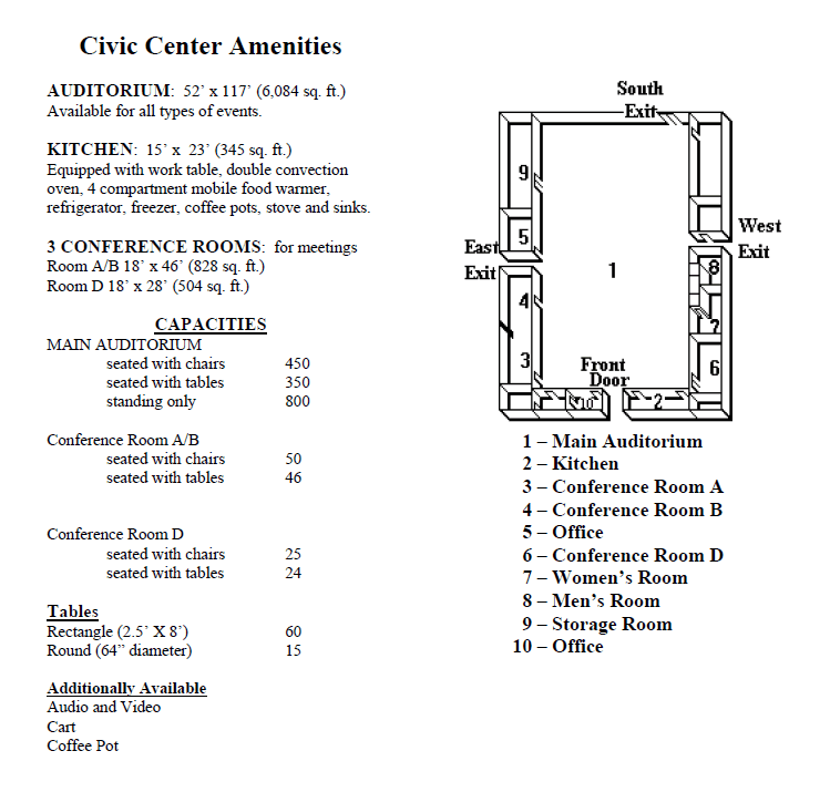 We offer the cleanest, best priced, and friendliest place to hold your event. Whether it is a family reunion, birthday party, anniversary, quince, graduation party, dance, or trade show the Civic Center is the ideal facility. Unlike other venues, everything you need to make your event a success, such as an in house PA system, microphones, podium, projector and screen, and Wi-Fi usage is included in our pricing.