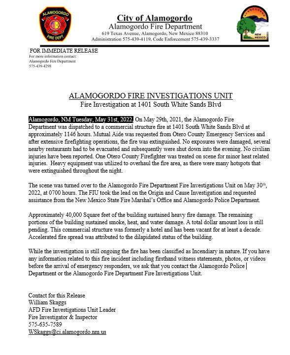 Press Release in reference to Fire Investigation at 1402 South White Sands Blvd
